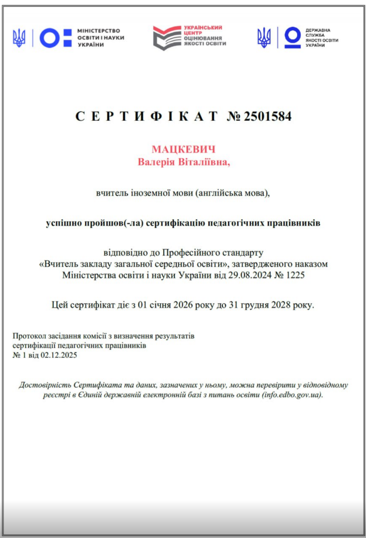 Сертифікація — це складний і відповідальний процес, який передбачає не лише перевірку знань, а й оцінювання професійної діяльності, здатності створювати комфортне та мотивувальне середовище для учнів, уміння застосовувати інноваційні підходи та бути відкритими до нових педагогічних практик.
