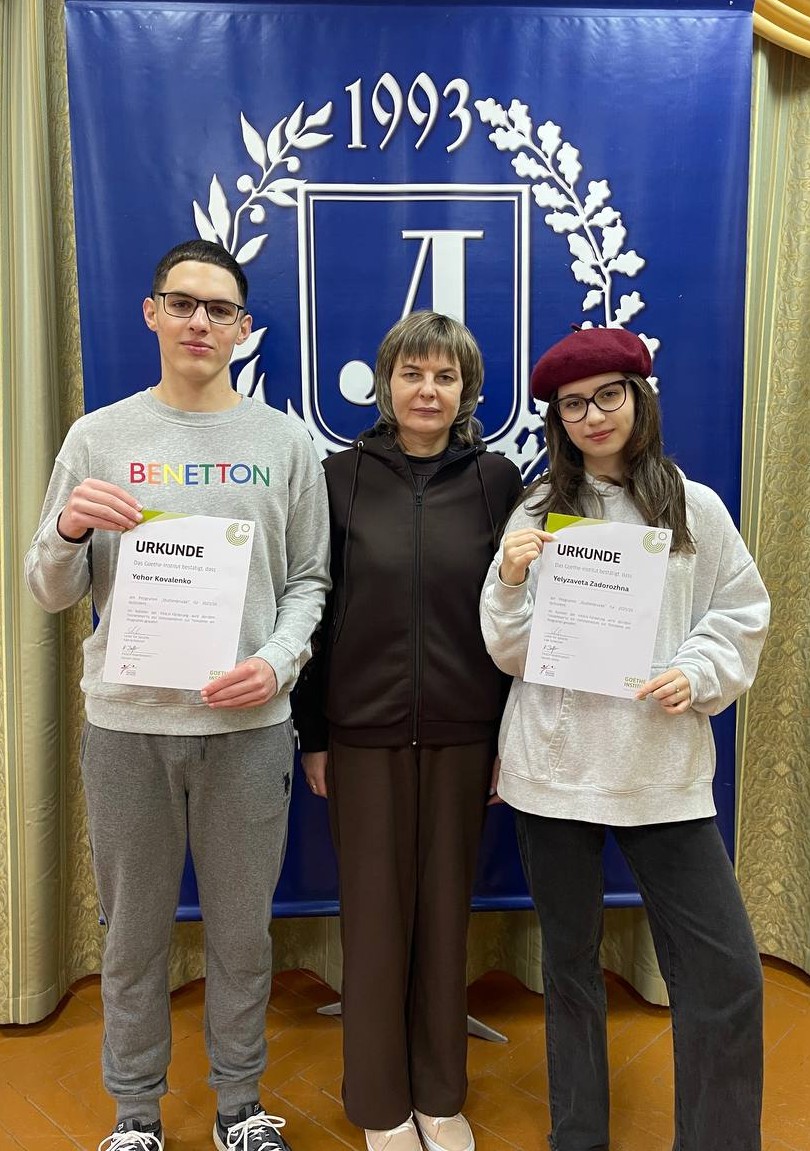 Успішно склавши іспити B2 в Goethe-Institut, учні 11-Б класу Єлизавета Задорожна та Єгор Коваленко одержали стипендії на участь у програмі "Studienbrücke" - "Міст до вищої освіти". "Studienbrücke" - це можливість навчатися в Німеччині, якщо успішно складеш іспит після проходження курсу. Пишаємось Єлизаветою та Єгором та сподіваємося на досягнення поставлених цілей.